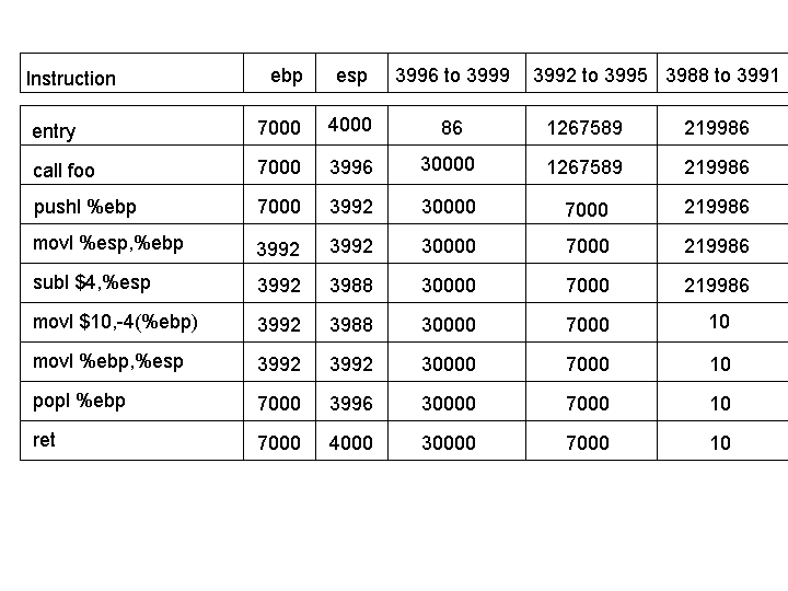First, the value of the stack pointer is copied to ebp, the base pointer register. The base pointer is used as a fixed reference to access other locations on the stack. In the program, ebp may be used by the caller of foo also, and hence its value is copied to the stack before it is overwritten with the value of esp. The instruction subl $4, %esp creates enough space (four bytes) to hold an integer by decrementing the stack pointer. In the next line, the value 10 is copied to the four bytes whose address is obtained by subtracting four from the contents of ebp. The instruction movl %ebp, %esp restores the stack pointer to the value it had after executing the first line of foo and popl %ebp restores the base pointer register. The stack pointer now has the same value which it had before executing the first line of foo. The table below displays the contents of registers ebp, esp and stack locations from 3988 to 3999 at the point of entry into main and after the execution of every instruction in Listing 4 (except the return from main). We assume that ebp and esp have values 7000 and 4000 stored in them and stack locations 3988 to 3999 contain some arbitrary values 219986, 1265789 and 86 before the first instruction in main is executed. It is also assumed that the address of the instruction after call foo in main is 30000.